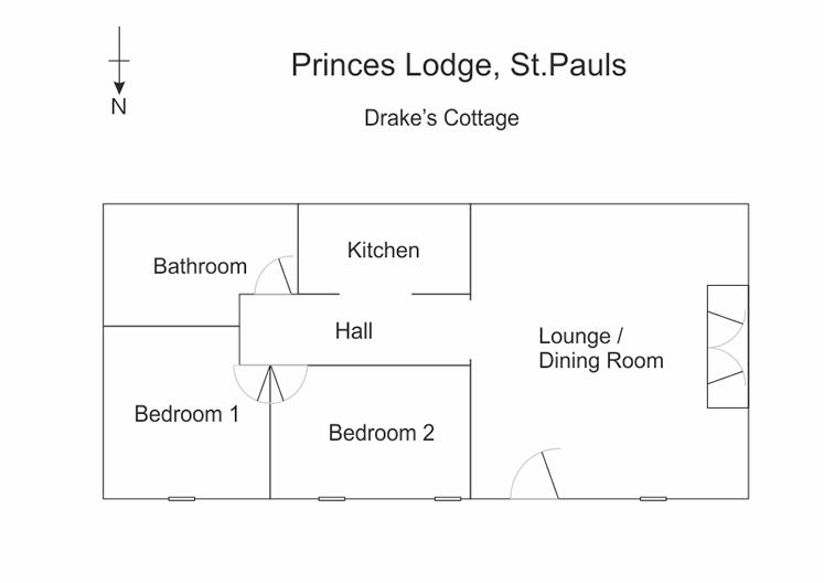 The bungalow has one exterior door and a double French window, both leading to the Lounge/Dining Room